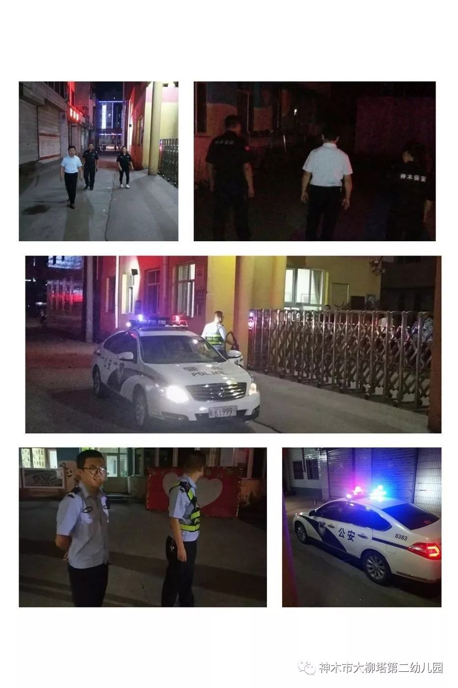 当夜幕降临,巡特警大队的叔叔和园领导、保安轮班进行夜间巡逻,排查幼儿园周边安全情况,保障幼儿夜间安全。