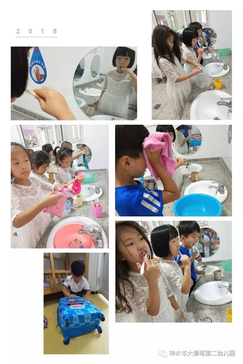 清晨孩子们开始洗漱,刷牙、洗脸,他们都能独立完成并整理好自己的洗漱用品。
